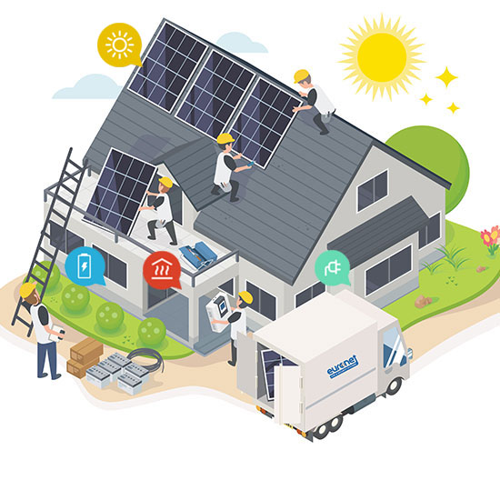 Fie ca solutie individuală sau globala - cu un sistem fotovoltaic, stocare de energie si pompa de caldura aer-apa va puteti alimenta cu energie regenerabila.